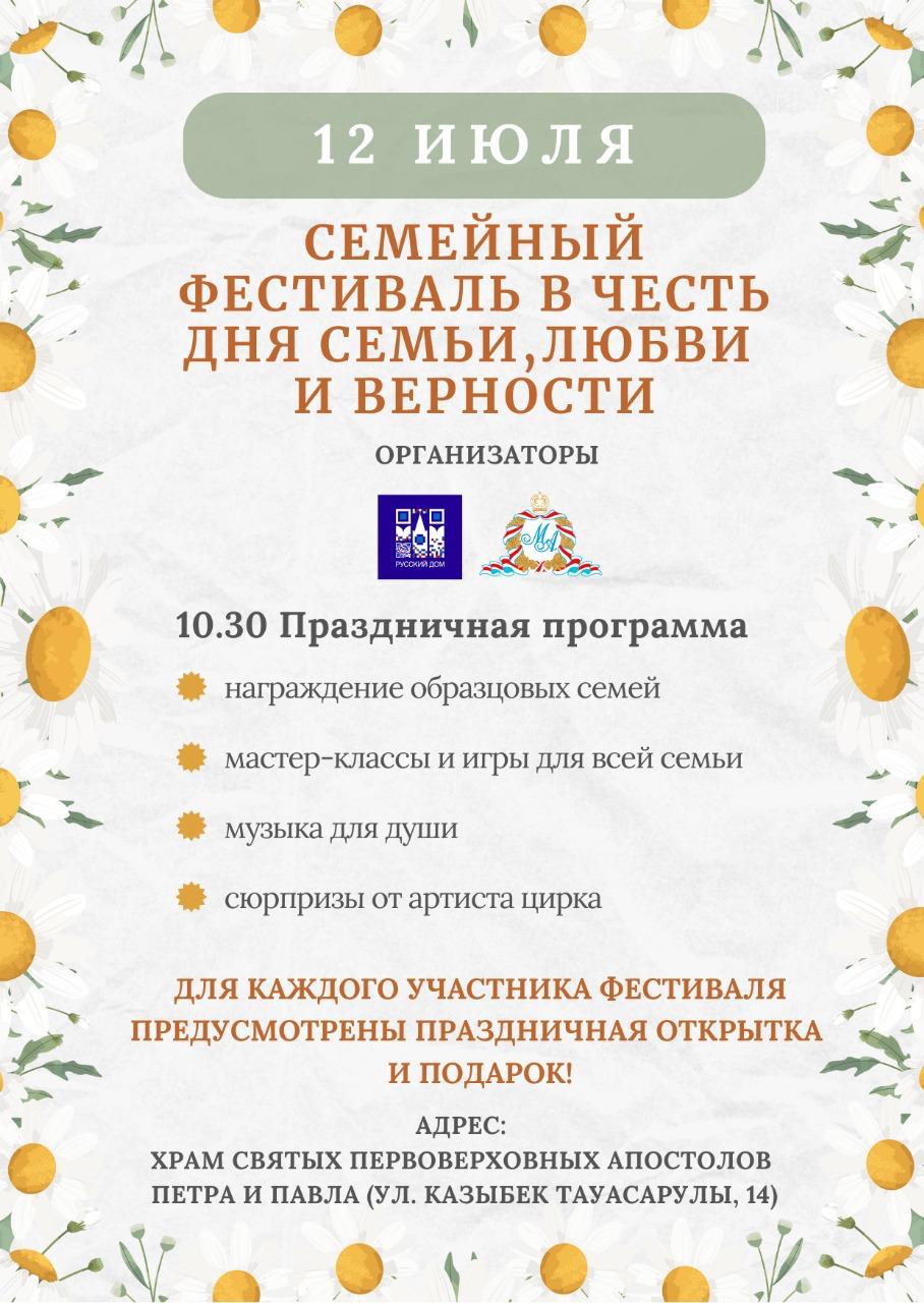 Дорогие братья и сестры! Всех вас приглашаем на Престольное Торжество 12 июля. Начало богослужения в 8:30. Божественную Литургию возглавит митрополит Алматинский и Казахстанский Александр. По завершениии Литургии крестный ход во двор храма где будут освящены начатки фруктов и овощей и сразу начнется семейный фестиваль в честь дня семьи и верности.